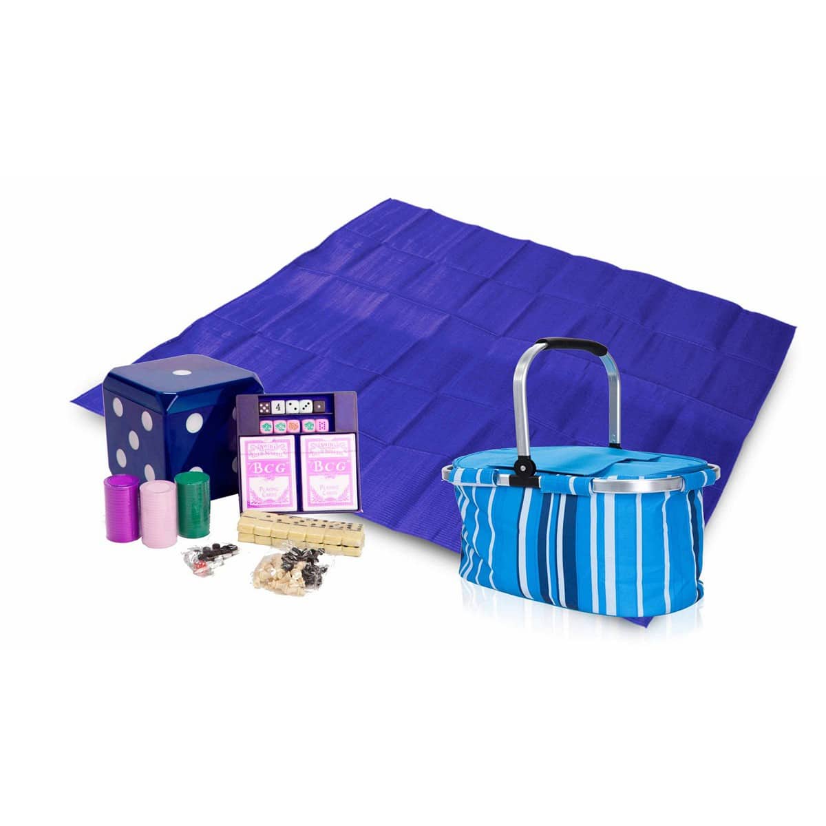 סט טיולים וקמפינג הכולל מחצלת משפחתית ענקית 180X260 מדגם פומיקי, צידנית כלים ל4 סועדים כולל כלים מדגם פארק וסט 7 משחקים מדגם גיימר