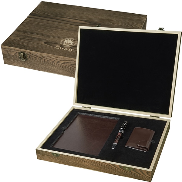 מארז מתנה מעץ עבור מחברת, ארנק בטיחות ועט מבית המותג גבעוני